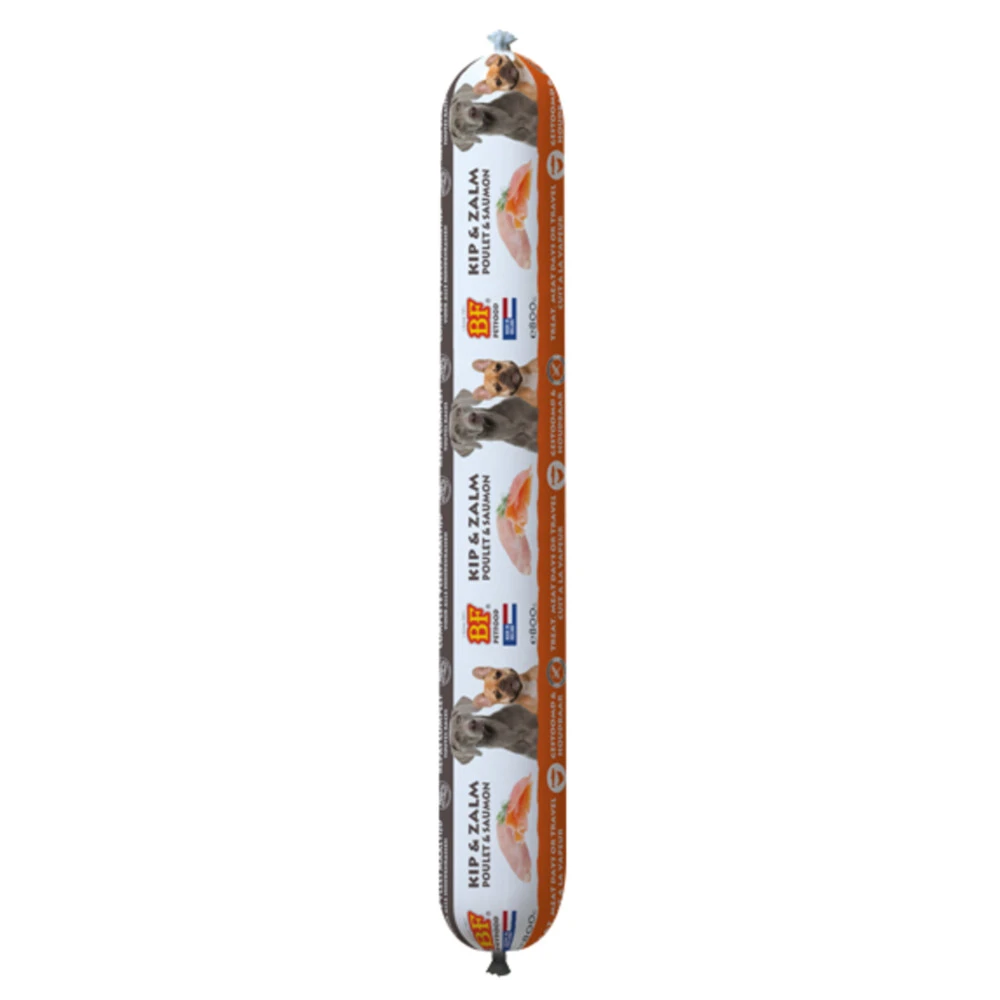 BF Petfood Vleesvoeding Hondenvoer Met ZalmBF Petfood vleesvoeding is een natuurlijke, complete en houdbare hondenvoeding op basis van verse zalm, kip, orgaanvlees, rijst, schapenvet en natuurkruiden. Is uitermate geschikt voor vleesdagen, als traktatie, voor onderweg, smaakmaker, bij omschakeling naar ander voer of voor honden die slecht reageren op droogvoeding. Handige 800g worst. Geschikt voor iedere hond, van pup tot senior.natuurlijke, complete houdbare hondenvoedingop basis van verse zalm