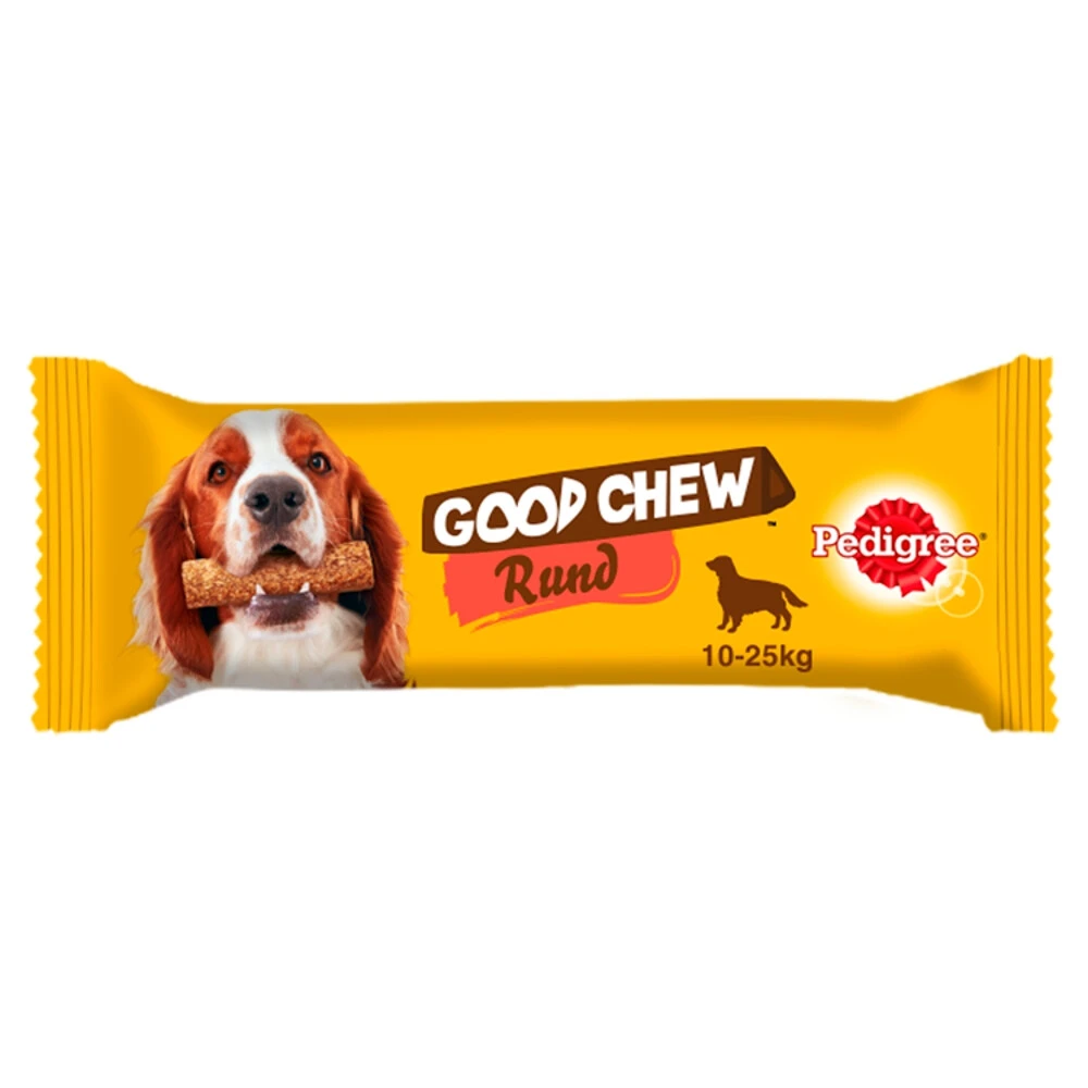 Pedigree Good Chew MediumHonden vinden het van nature heerlijk om te kauwen. Maar je ziet je viervoeter natuurlijk niet graag met je schoenen of gevaarlijke voorwerpen.Pedigree Good Chew is een veilige kauwsnack waar je hond langdurig op kan kauwen. Vriendelijk voor de maag en heel erg lekker. Het wordt geproduceerd in de EU met hoogwaardige ingrediënten en heeft een tandvriendelijke textuur die perfect tussen hard en zacht in zit. Zo kun je met een gerust hart je hond veilig laten kauwen.T