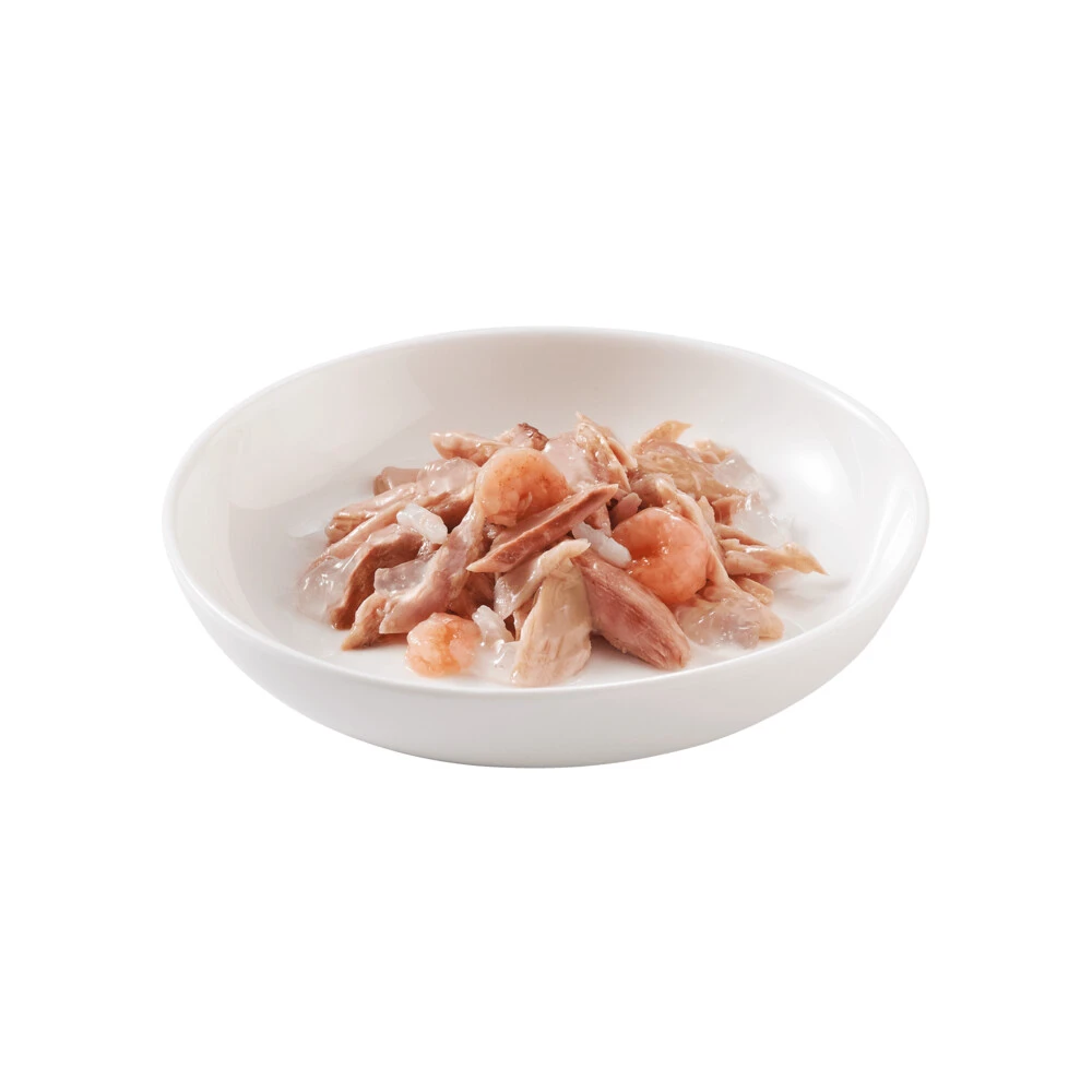 Schesir Kattenvoer Tonijn – Garnaal in GeleiHet recept is op basis van echte, heerlijke tonijnfilets gecombineerd met garnalen, de kleine heerlijke schaaldiertjes waar je nooit moe van wordt. In gelatine bereid, om de voorkeur tegemoet te komen van katten die houden van de verfijnde smaak van de zee in combinatie met een compactere consistentie in de kom.Hoofdbestanddeel tonijn gecombineerd met een smaakvolle garnaal-topping100% natuurlijke ingrediëntenGestoomd en met de hand verwerkt