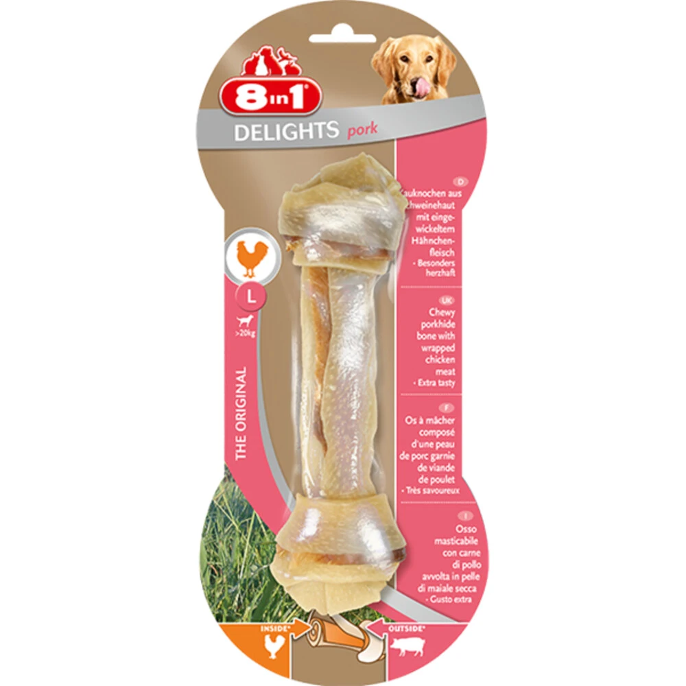 8in1 Delights Pork LKauwbot van varkenshuid gevuld met kippenvlees. Dankzij de lekkere combinatie van smaken kauwt de hond graag en intensief op het bot. Voor langdurig kauwplezier – de ideale gebitsverzorging.Heerlijke smaakvariantUniek en gepatenteerdVerzorgt de tandenSpeelt in op het natuurlijke kauwinstinct van de hondVermindert tandplak en voorkomt zo de vorming van tandsteenLangdurig kauwplezier zonder restjes6% vetZonder kunstmatige kleurstoffen en smaakversterkers