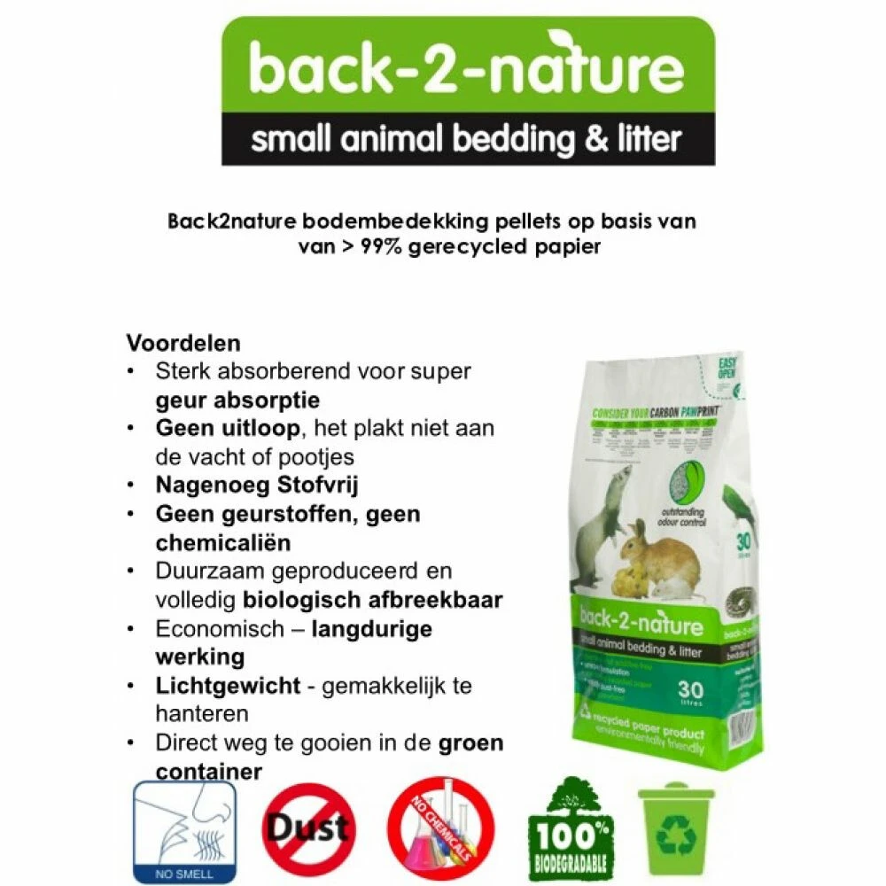 Back 2 Nature Gerecyclede BodembedekkingDe unieke Back-2-Nature bodembedekking voor knaagdieren en andere kleine dieren is gemaakt van 99 % gerecycled papier zonder toevoegingen of chemicaliën. Erg geschikt voor gebruik bij: konijnen, knaagdieren, vogels en reptielen. De bodembedekking is:StofvrijSterk absorberend voor super geur absorptieDuurzaam geproduceerd en volledig biologisch afbreekbaarDirect weg te gooien in de groen containerEconomisch