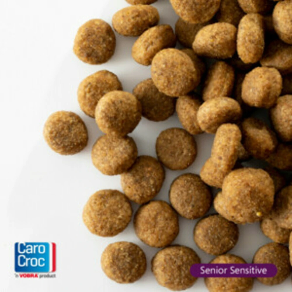 CaroCroc Hondenvoer Senior SensitiveWanneer je hond ouder wordt verandert zijn energiebehoefte. Senior honden (vanaf 7 jaar) hebben minder eiwitten en mineralen nodig vanwege een tragere stofwisseling en een mogelijk afnemend activiteitsniveau. Voor het welzijn van jouw trouwe viervoeter is het dan ook van belang om het voer aan te passen wanneer deze nieuwe levensfase wordt bereikt om zo de gezondheid optimaal te ondersteunen.De verse lam in de brokken is licht verteerbaar en ondersteunt oudere
