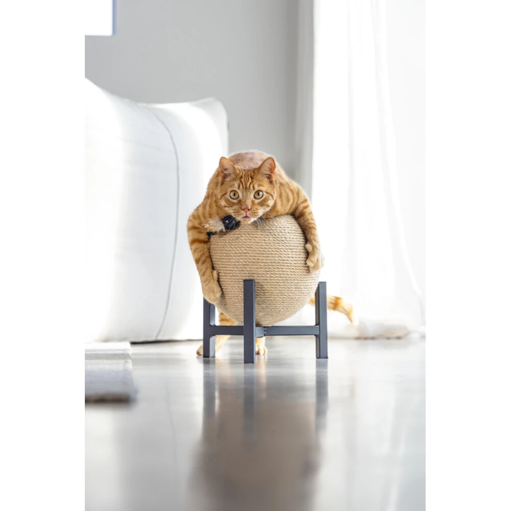 Designed by Lotte Krabbol Hout TyraMet de Designed by Lotte Krabbol Tyra heb jij een ware parel in huis. Deze krabbol is te gebruiken als krabpaal, maar door de ronde vorm net even wat anders dan een standaard krabpaal. Jouw kat zal het heerlijk vinden om zijn of haar nagels in het jute touw te zetten.Het kattenspeeltje met veer, aan de bovenzijde van deze krabbol, maakt deze bol ook te gek om mee te spelen. Aan de onderzijde van het metalen frame zijn rubberen dopjes geplaatst. Dit om verschuiv