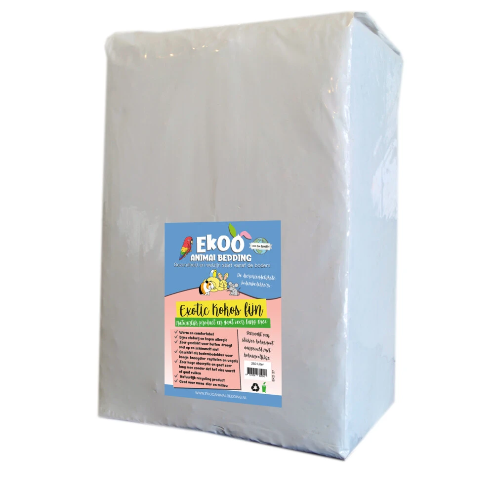 Ekoo Exotic Kokos Fijn 250 literEkoo Exotic Kokos Fijn is een natuurlijk product en gaat zeer lang mee. Geschikt als bodembedekker voor konijn knaagdier reptielen en vogels. Gemaakt van stukjes kokosnoot (80%) aangevuld met kokosnootvezel (20%). Land van oorsprong: West Afrika en Srilanka. Voor welke dieren geschikt: Konijn, cavia, hamster, rat, muis, kippen, vogels en reptielen.Warm en comfortabelBijna stofvrij en tegen allergieZeer geschikt voor buiten droogt snel op en schimmelt nietGeschikt