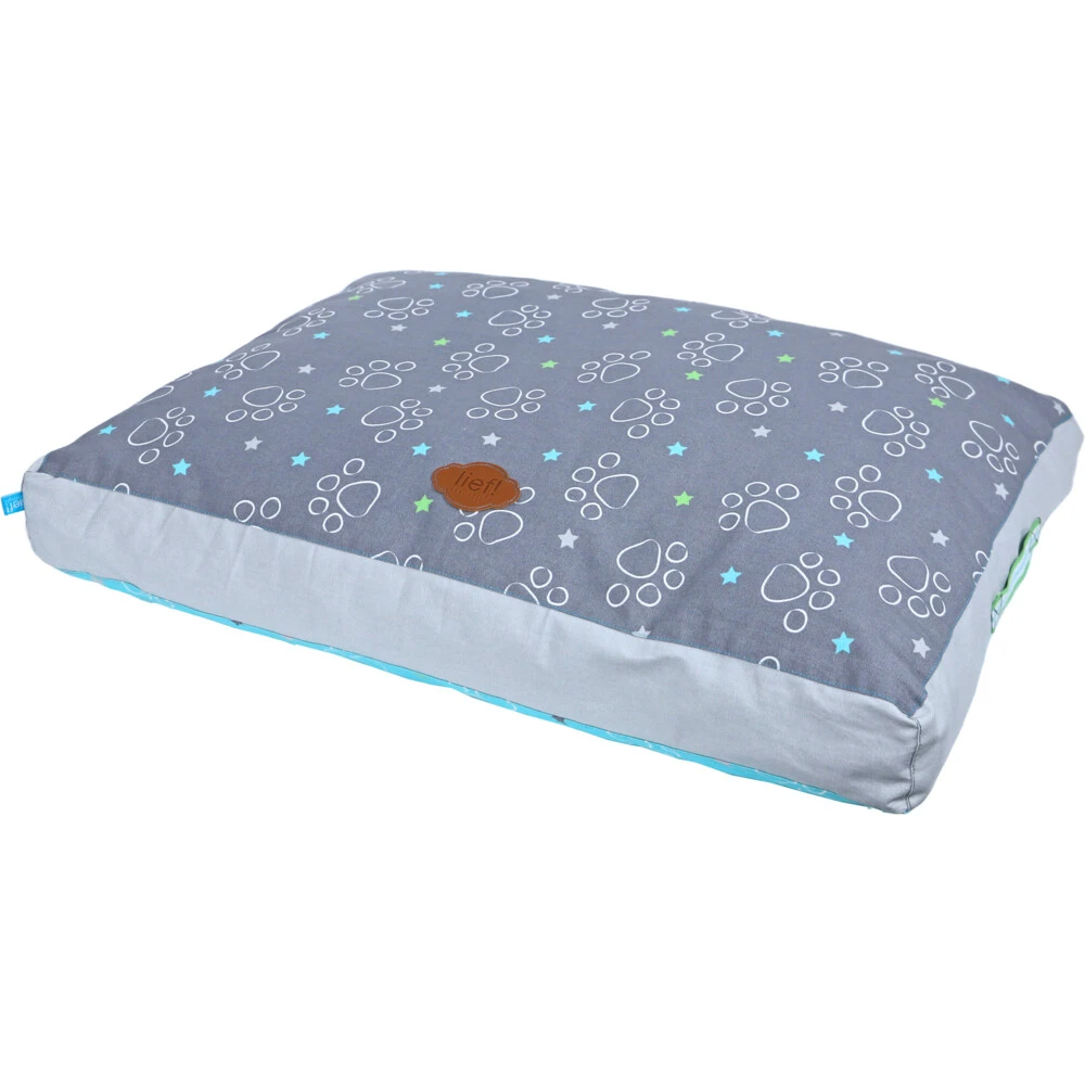 Lief! Loungekussen 2-zijdig Boyslief! Boys loungekussen 2-zijdig is een ligkussen voor honden waar ze heerlijk op kunnen liggen. Het kussen is lichtblauw aan de ene kant en donkergrijs aan de andere kant met een Boys en poot print aan beide kanten. De mooie details maken dit kussen helemaal af, zoals de handgrepen aan de zijkant van het kussen. 2 kanten te gebruikenGoed gevuldMet handgrepen