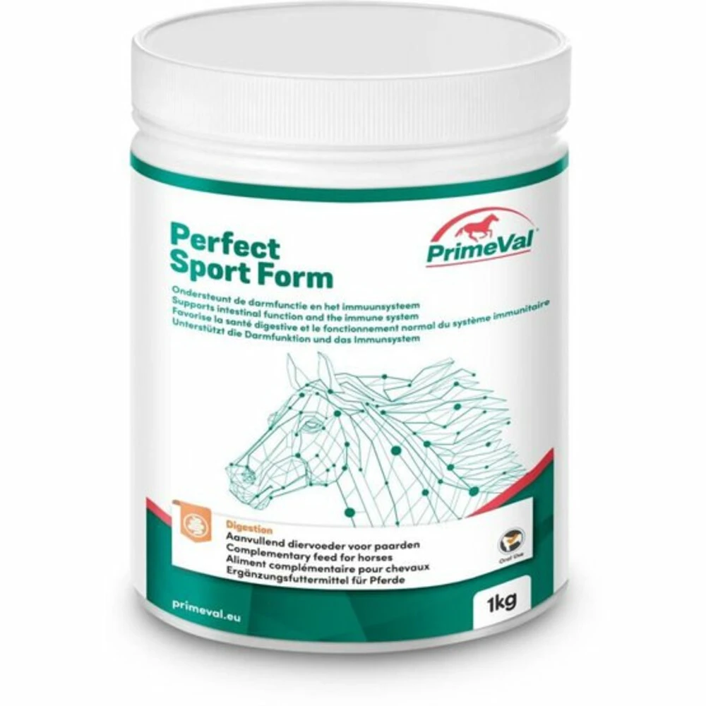 Primeval Perfect Sport FormPrimeVal Perfect Sport Form ondersteunt de gezondheid van binnenuit. Een goede spijsvertering en een goede weerstand dragen bij aan de vitaliteit van het paard. PrimeVal Perfect Sport Form bevat belangrijke vitaminen, mineralen en prebiotica ter ondersteuning van de spijsvertering. Dit helpt de darmflora te versterken.Ideaal tijdens het wedstrijdseizoen om het herstel te bevorderen, of om te gebruiken bij een langere periode van training of ziekteDraagt bij aan de weer