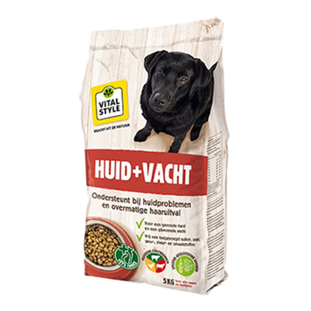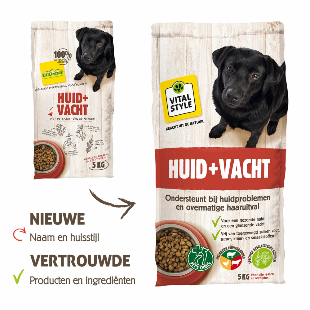 VITALstyle Hondenvoer Huid & Vacht VITALstyle (voorheen ECOstyle) huid en vacht hondenbrokkenIn VITALstyle (voorheen ECOstyle) huid en vacht hondenbrokken zitten bewust veel verschillende ingrediënten. Meerdere soorten vlees (diverse, goed verteerbare eiwitbronnen), granen en andere natuurlijke grondstoffen. Zo daag je de spijsvertering van je hond uit en dit geeft een goede vertering. Omega 3 + 6 en prebiotica helpen ook mee. Er ontstaan geen eiwitreststoffen meer die voor klachte