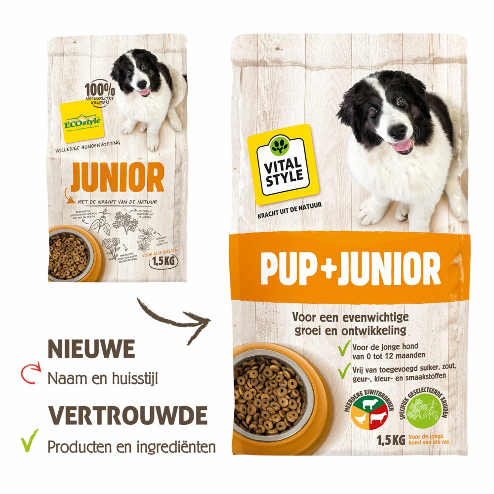 VITALstyle Hondenvoer Puppy – JuniorVITALstyle (voorheen ECOstyle) volledige hondenvoeding voor je puppy en jonge hond.Deze brok is een complete voeding: alles wat je jonge hond nodig heeft, zit er in. De eerste maanden heeft je pup specifieke voedingsstoffen nodig voor een evenwichtige groei en ontwikkeling. Ook moet de darmflora en de hele spijsvertering in balans komen. Daarom zijn alle ingrediënten zorgvuldig geselecteerd. Ook de kruiden zijn precies afgestemd op het jonge dier in ontwi