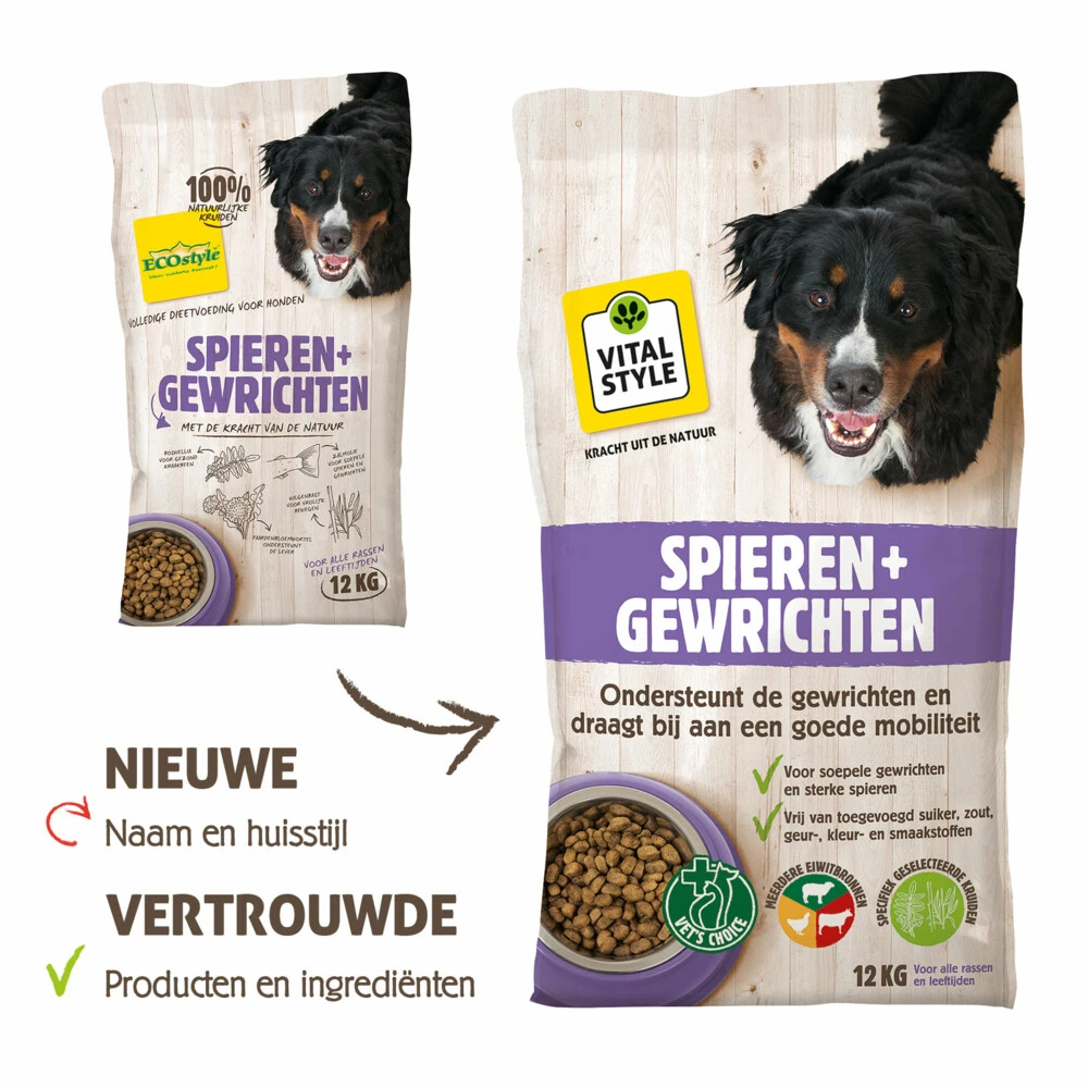 VITALstyle Hondenvoer Spieren & GewrichtenVITALstyle (voorheen ECOstyle) spieren en gewrichten hondenbrokkenDe ingrediënten in spieren en gewrichten ondersteunen de gezondheid van de gewrichten bij slijtage (osteoartritis) en dragen bij aan de opbouw van kraakbeen. Extra zalmolie met hoge concentraties omega-3 vetzuren (EPA en DHA), speciale kruidenextracten, waaronder Boswellia, Paardenbloemwortel en Wilgenbast, maar ook bèta-glucanen en gelatinehydrolisaat (collageeneiwit) help